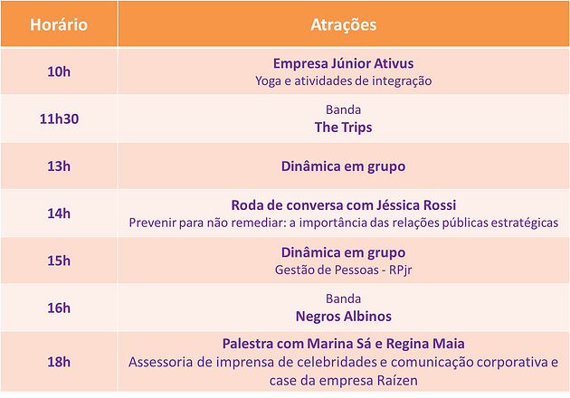 Para que todos participem da comemoração do Dia Nacional de Relações Públicas, estará acontecendo uma programação cultural, com o objetivo de entreter e propagar a profissão de relações-públicas para todos os alunos do câmpus.